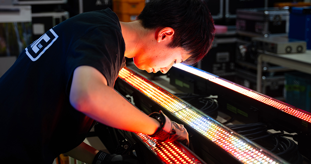 テレビやコンサート現場で使用される自社開発の電飾系機材をはじめ、常設の案件で使用されるLEDビジョンなどの映像系機材の品質管理を担当しています。また、最近はプロジェクションマッピング事業にも注力しており、事前シミュレーションや設営・現場対応なども行っています。これら以外にもいろいろな業務に携わっているため、部署内でもマルチな動きをしています。