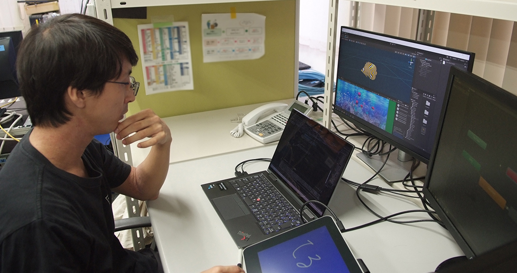 私の所属するソフトウェアエンジニア課では、テレビ番組で使用するクイズ回答システムや、得点集計やランキング生成を行うシステム、イベントで使うデジタルサイネージの制御、プロジェクションマッピングやセンサーを使ったデジタル遊具の製作など。お客様からの「こういうことがやりたい」という要望を主にソフトウェアによるアプローチで形にして実現するのが仕事です。また、実際に現場で仕込みや操作をするのは別部署の方々なので、事前準備として操作方法を解説するといったこともします。そこでいただいたフィードバックなどをもとに、現場が円滑に進むように準備を整えます。これらに付随して、使用するPCなどの機材についても理解を深め、管理をしています。